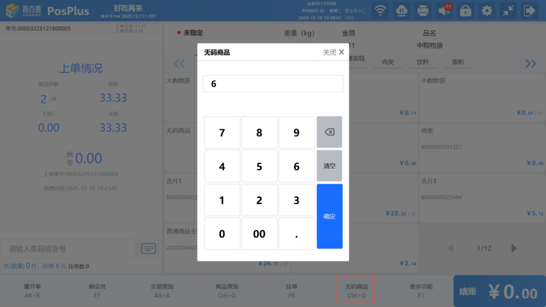 针对无需扫码的商品快速销售场景,我们在触摸屏销售主界面新增了“无码商品”按钮,适用于散装商品、服务项目、临时加价等任何需要快速录入金额的交易。