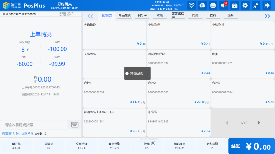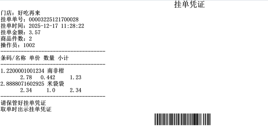 前台销售商品时,点击“挂单”按钮即可打印挂单凭证。