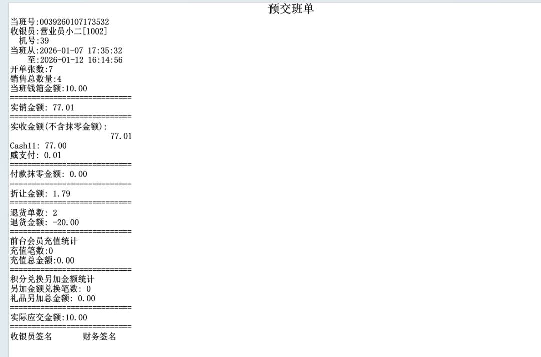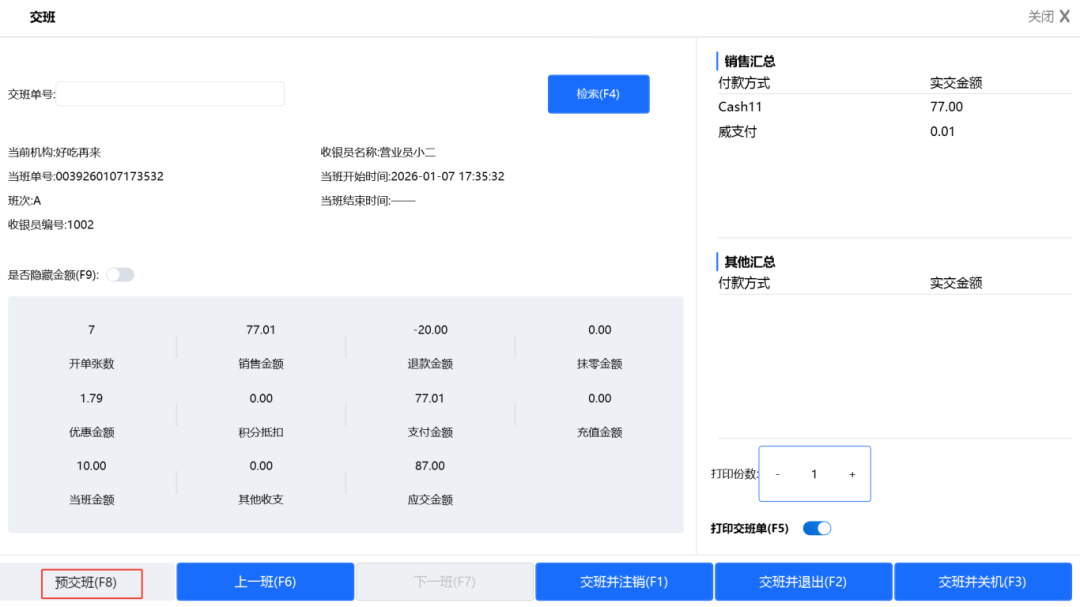 在正式交班前,可预先打印班次核对单,方便提前清点、核对营业额及单据,使交接班过程更加顺畅、无误。