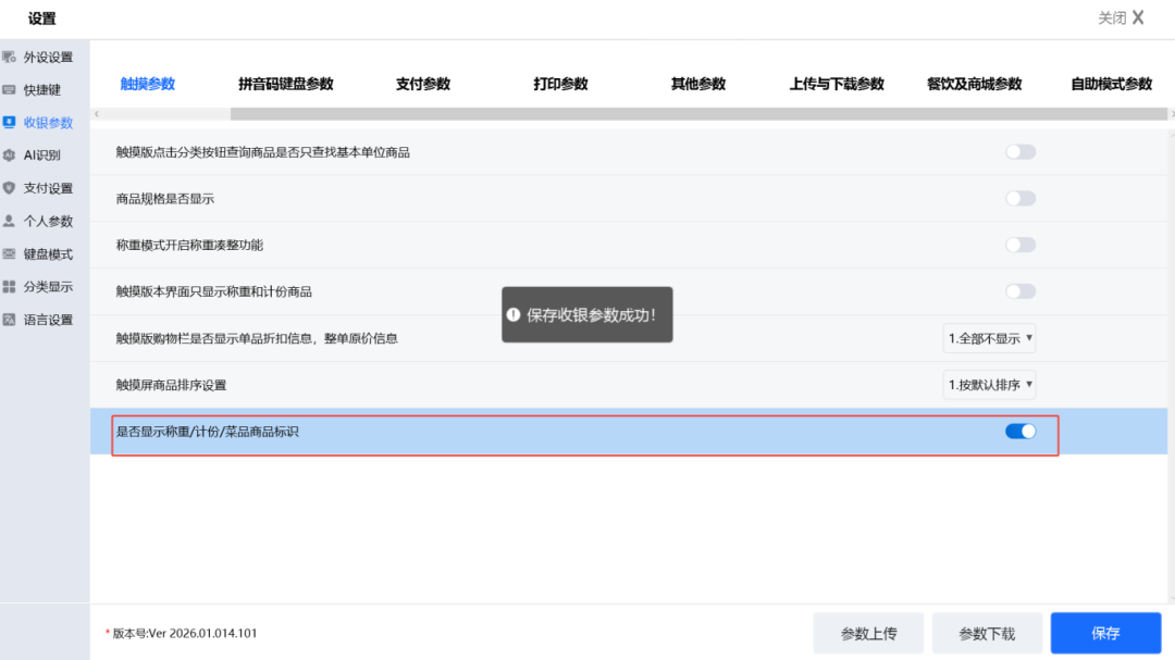 升级至 Ver 2026.01.014.101 以上版本,在【设置】-【收银参数】-【触摸参数】中开启。