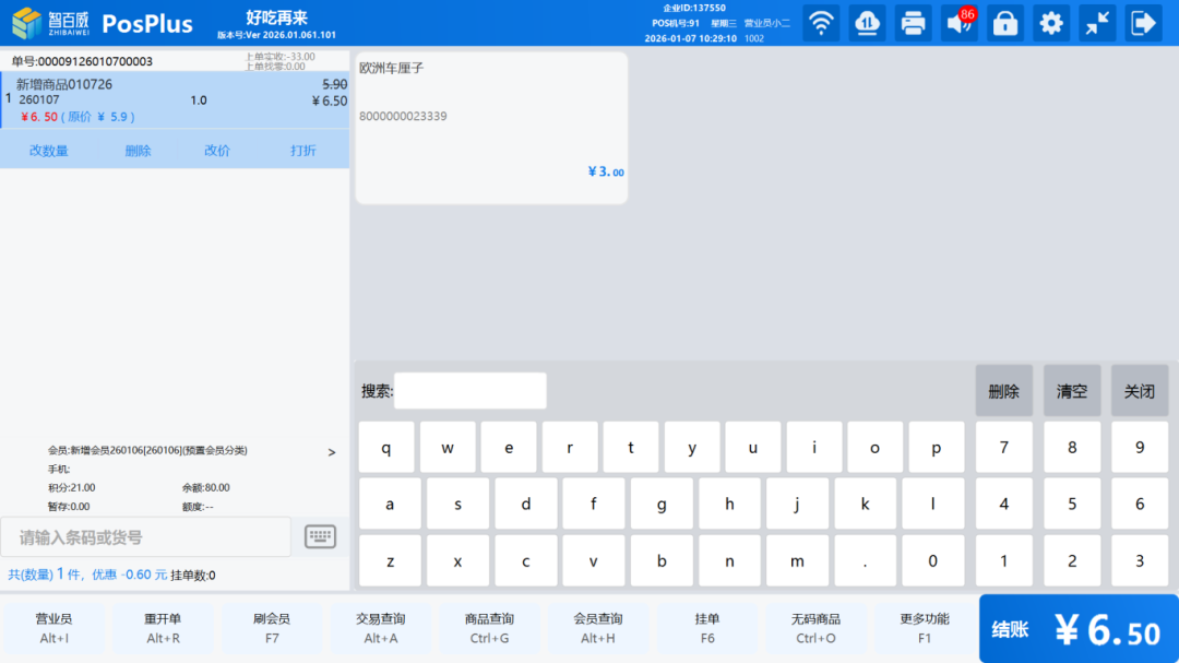 进入前台销售主界面,将会员价高于零售价的商品加入购物栏,刷会员,商品显示会员价。